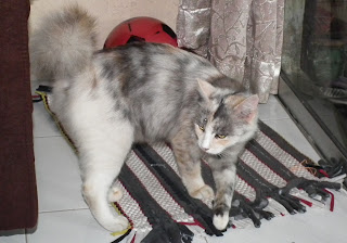 malam tadi tidur dalam rumah.saya suruh letak kt luar along takut hilang.pagi2 tadi...ambik ngko.dia melepas kat dalam rumah.alonglah kena cuci.sanggup ja dia ni demi seekor kucing.almaklum..perkataan pertama yg keluar dari mulut dia masa baby dulu pun nama kucing...mmmmm...